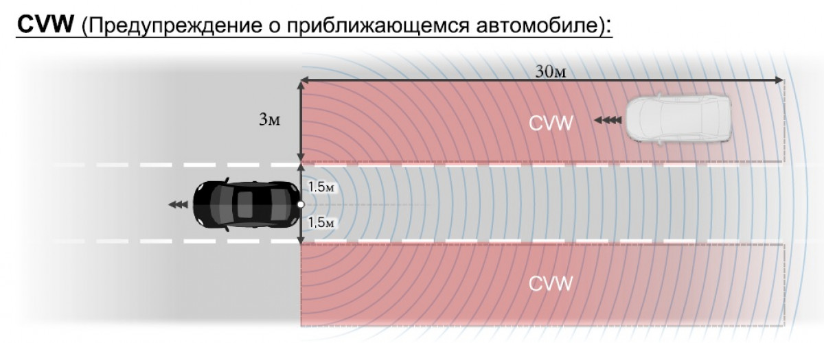 CVW (Closing Vehicle Warning, предупреждение о приближающемся транспортном средстве) — до 30 метров